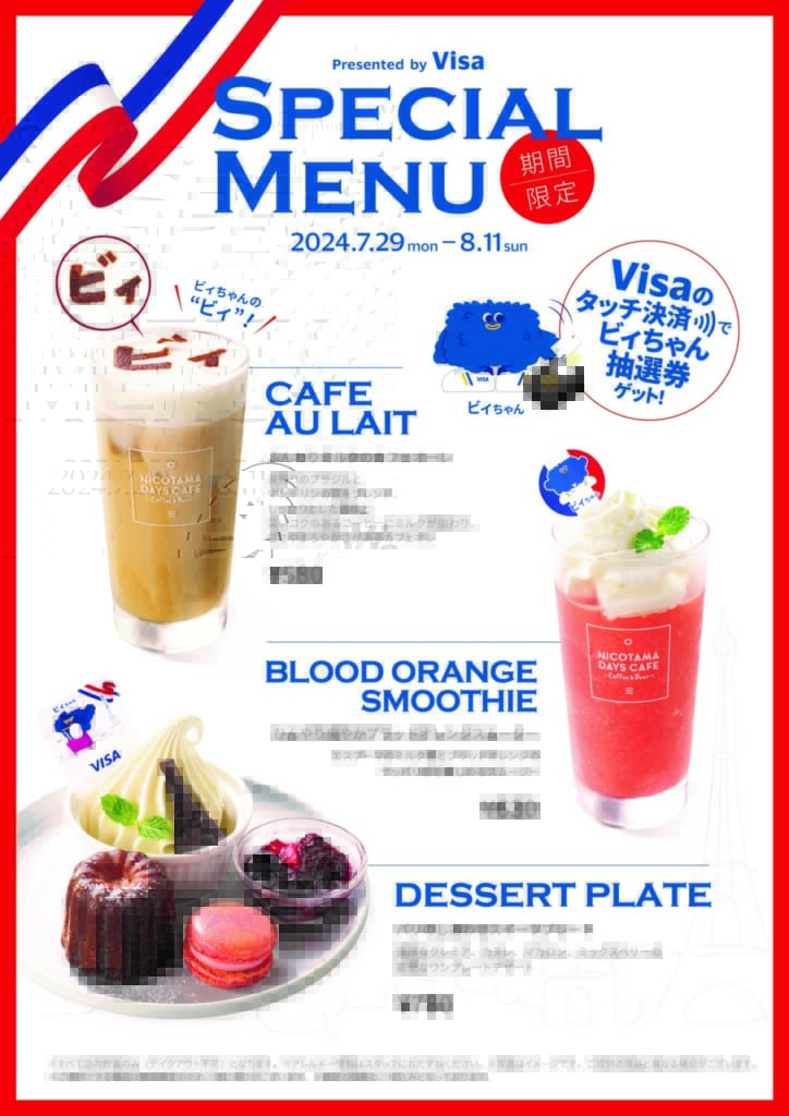 期間中はVisaの公式マスコット「ビィちゃん」とのコラボメニューとして、ドリンク2品・デザートプレート1品をご用意しているとのこと!