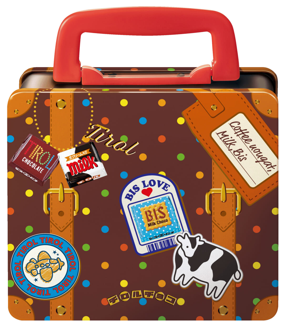 チロルチョコから定番人気フレーバー3種入りの「トランク缶」が10月21日(月)より全国で発売されます。オリジナルデザインの旅行かばん型の容器に、コーヒーヌガー・ミルク・ビスの人気フレーバーのチロルチョコが12個詰められています。