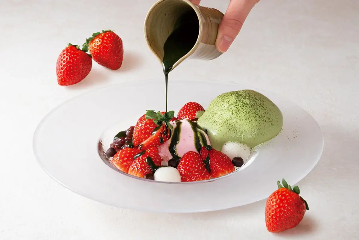 苺とふわふわ食感の「抹茶フローシークリーム」を抹茶みつと味わう新感覚スイーツ。