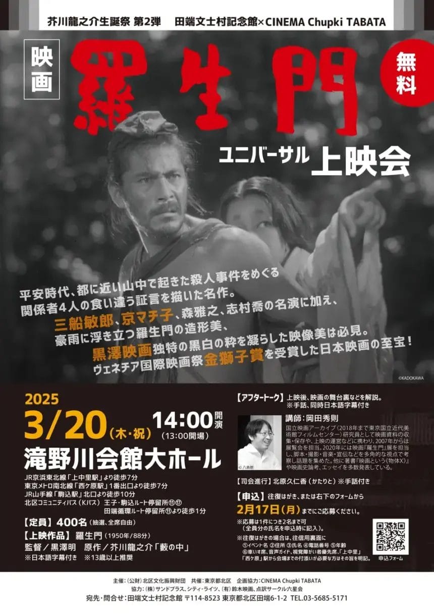 平安時代、都に近い山中で起きた殺人事件を巡り関係者4人の食い違う証言を描いた物語。ヴェネツィア国際映画祭金獅子賞を受賞した日本映画の傑作です。ユニバーサル映画館「シネマチュプキ タバタ」と協力し、字幕・音声ガイド(要問合せ)付きで上映。さらに終演後には日本映画研究者を招き、映画の裏話を紹介します。