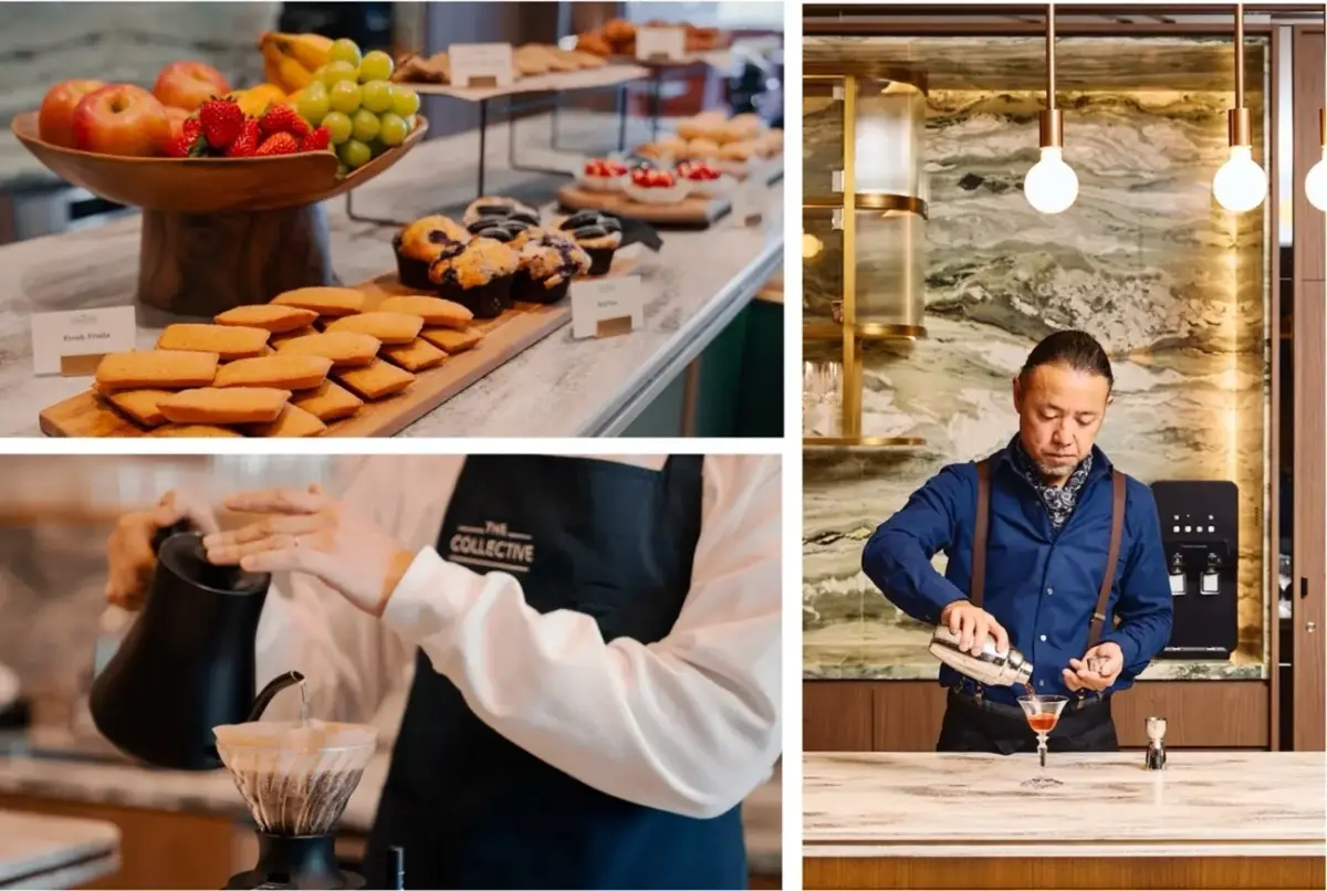 シンガポールの高級紅茶ブランドであるTWGとのコラボレーションにより常時6種類の紅茶をお楽しみいただけるTWGティートランクをはじめ、京都にフラッグシップを持ち世界展開するスペシャルティコーヒーブランド「%アラビカ」の厳選したコーヒー、平日の朝にはホテルやラウンジのような朝食サービスと、夕方からはアペリティアワーとしてビールやワイン、おつまみなどもご提供します。さらに金曜日には専属バーテンダーによるTWGオリジナルカクテルや、アラビカの豆を使ったエスプレッソマティーニをお楽しみいただけます。