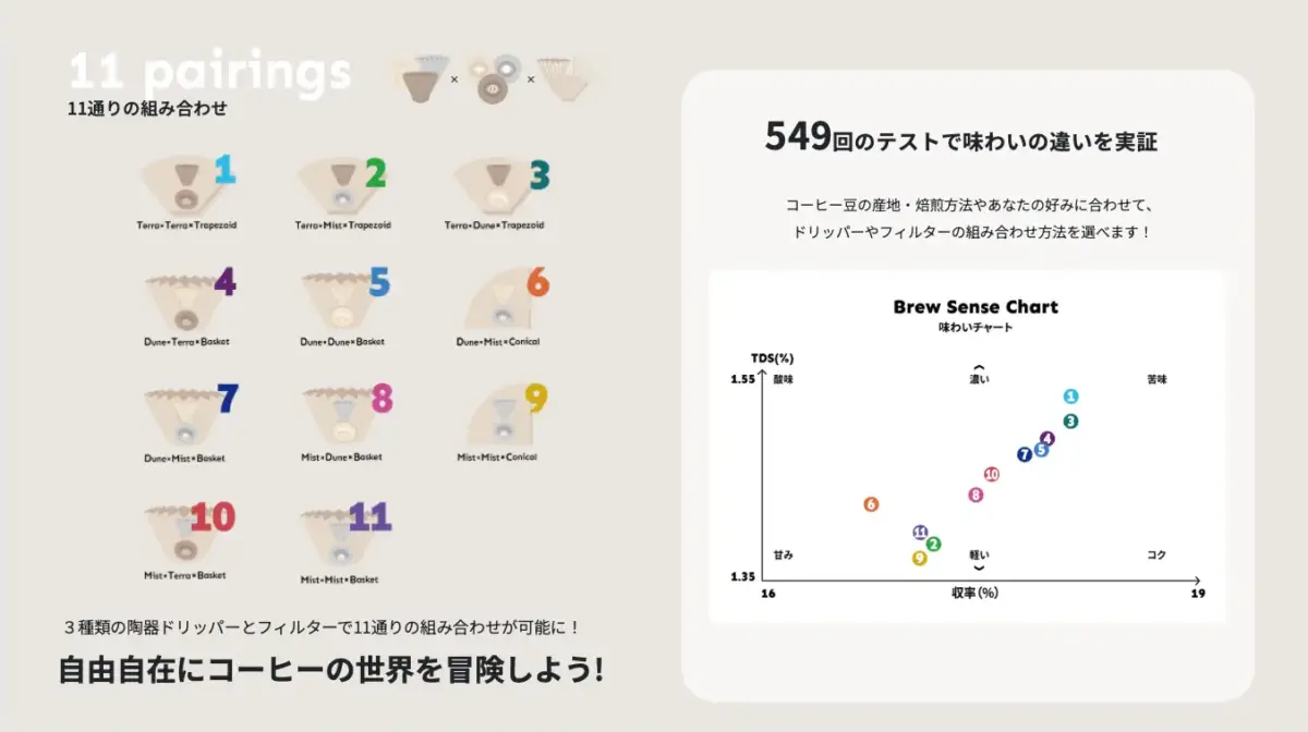 上下セパレート式の3種類のドリッパーと3種類のフィルター(自社商品)を組み合わせることにより、11通りの味わいが抽出可能となります。酸味・苦味・甘さ・コクなどの味わいや香りに変化が生まれ、浅煎りから深煎りまで幅広くお楽しみいただけます。
