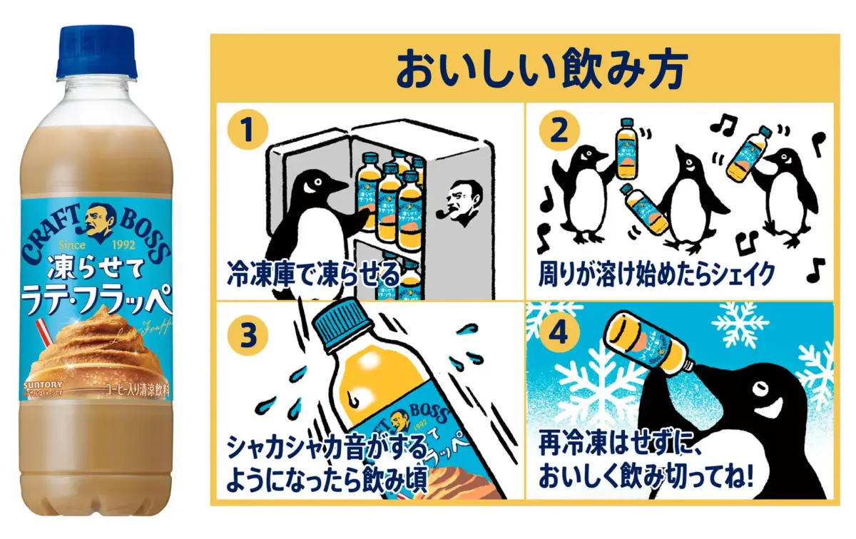 今回、「より手軽に、便利に、フラッペをお楽しみいただきたい」という想いのもと、再栓可能で持ち運びしやすく、ご家庭でも楽しめるペットボトル飲料で「クラフトボス 凍らせてラテ・フラッペ」を発売します。