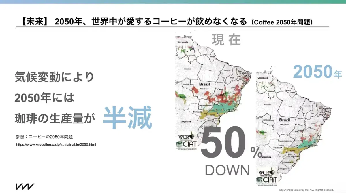 そんなコーヒーは、2050年、気候変動により生産量が半減。コーヒーが飲めない世界が到来します。(コーヒー2050年問題)