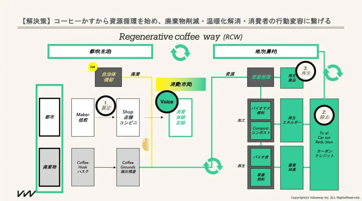 世界中で毎日21億杯以上消費されているコーヒー。世界で1億人以上が働いているコーヒー。その全てのコーヒー消費が資源循環することが我々のゴールです。そして単に資源循環するのではなく、持続可能な状態で永続して続くよう、「楽しい」と経済的メリットの両軸を大事にして推進していきます。