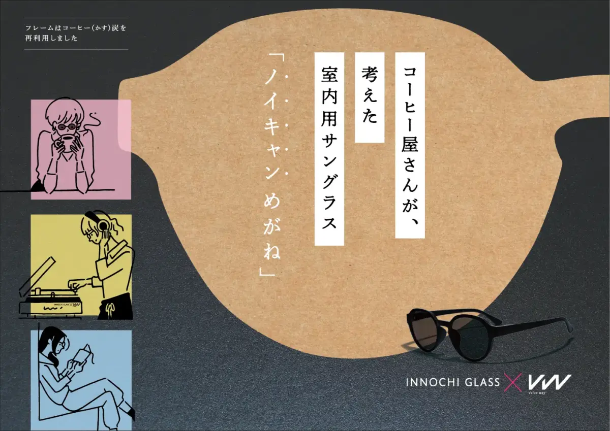 コーヒーを中心とした再生・循環経済の実現を目指すValue way株式会社(本社:兵庫県神戸市、CEO:八木俊匡、以下Value way)は、2023年10月に設立。コーヒー2050年問題解消に向けて、リジェネラティブ珈琲や気候変動アクションを推進し、カーボンフットプリント算定サービス、カーボンクレジットの開発、コーヒーかすの再資源化を遂行しています。この度コーヒーかすを再資源化した商品の第一弾として、特殊なカラーレンズを使い、「心地よい見え方」を追求する眼鏡「イノチグラス」を開発・企画・販売を行う眼鏡メーカー株式会社Innochi(イノチ)との共同開発で、地球にも身体にも優しい室内用サングラス「ノイキャンめがね」が誕生。世界中の人が楽しみながら、気候変動対策につながるアクションを推進できるきっかけづくりのため、国内最大級のクラウドファンディングサイト”CAMPFIRE”にて「ノイキャンめがね」の販売を開始します。