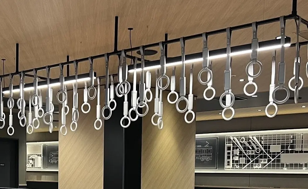 店内には、西鉄電車や西鉄バスで実際に使用されていた車両パーツやつり革、レールなど、役目を終えた素材がアート装飾として再構築され、訪れる人々を楽しませます。これらの廃材は、長年にわたり地域の移動や暮らしを支えてきた歴史の象徴でもあり、その再活用には「想いを引き継ぎ、次世代につなぐ」という強いメッセージが込められています。廃材に新たな命を吹き込むことで、過去と未来をつなぐ創造的な空間を演出している当店では、九州の鉄道が文化や人、情報、モノをつなげてきたように、地域の人々がふれあい、語らい、新たなつながりを育む『街の交差点』としての役割を担ってまいります。