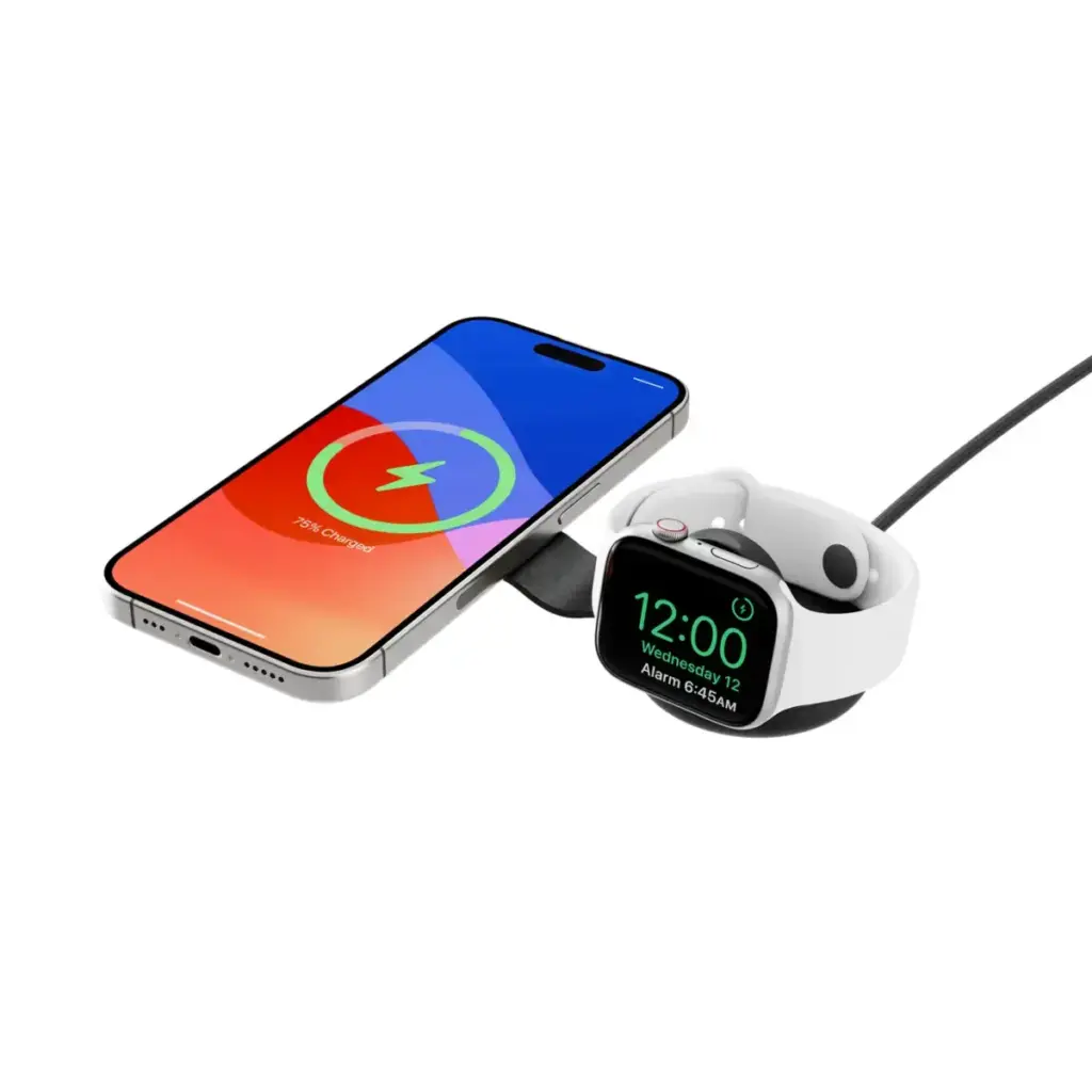 コンパクトなQi2、Apple Watch充電搭載の2-in-1ワイヤレス充電器です。AirPods Proケースとほぼ同じサイズのこの充電器は、旅行を念頭に置いて、省スペース設計されました。本体を開くと、2つのマグネット式充電器があらわれ、1つの電源でiPhoneとApple WatchまたはAirPodsを同時に充電します。さらに、iPhoneやApple Watchをハンズフリーで使えるスタンドにも変形します。