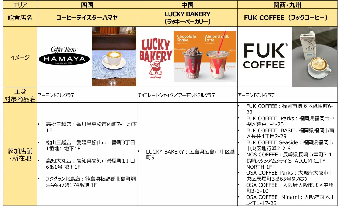 アーモンドミルクフェア参加飲食店の概要一覧