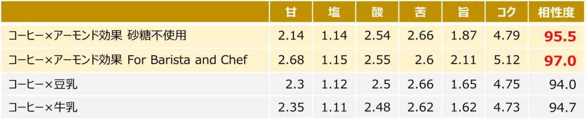 通常、相性度95点以上が非常においしいと判断される中、コーヒーとの掛け合わせにおいて、牛乳が94.7点、豆乳が94.0点、「アーモンド効果 砂糖不使用」が95.5点、「アーモンド効果 For Barista and Chef」97.0点という診断結果でした。牛乳や豆乳もコーヒーとの相性はよいものの、アーモンドミルク(アーモンド効果)はそれを上回っており、コーヒーの苦味・酸味とアーモンド効果の甘味・旨味が相乗効果でおいしさを引き出すことができ、コーヒーとアーモンド効果は相性が良いと実証されました。