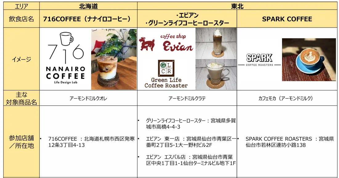 各店舗でアーモンド効果<For Barista and Chef>」を使用したドリンクメニューが特別価格でお楽しみいただけます。