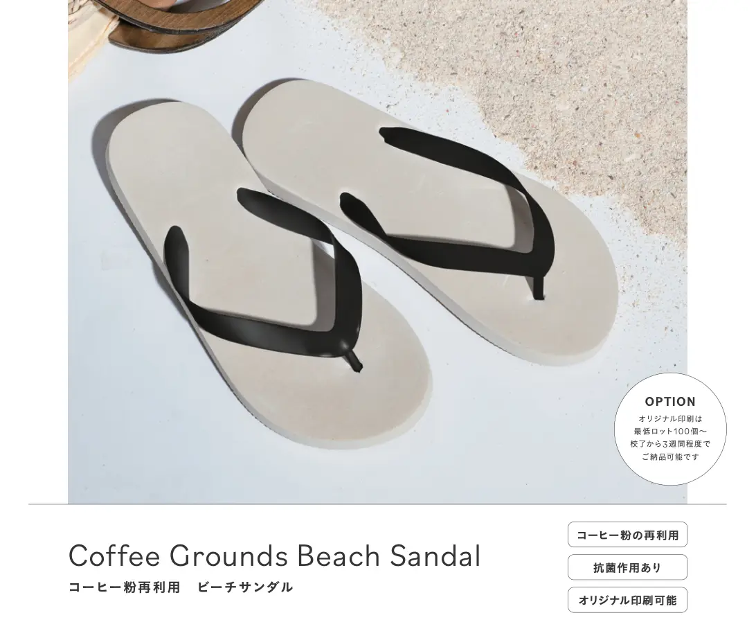 本展示会の注目製品は新製品3種。コーヒー粉を約11%配合したビーチサンダル、ウールやコットンを使用したサウナハットを初披露します。若者を中心に需要の高まるサウナや、これからの夏の季節に最適な製品を企画しました。オリジナル名入れも可能なため、他社との差別化が叶います。