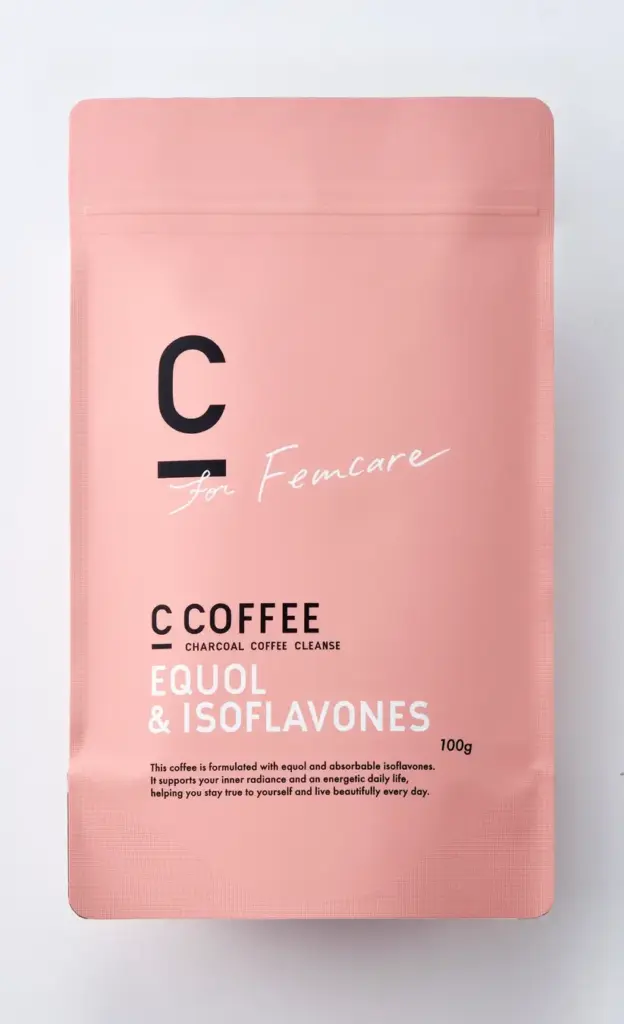 「C COFFEE EQUOL & ISOFLAVONES」にはシリーズ共通成分のチャコールに加え、大人女性をいたわる成分としてエクオールとイソフラボンを配合。さらに体に負担となるカフェインを可能な限り減らしたコーヒーです。