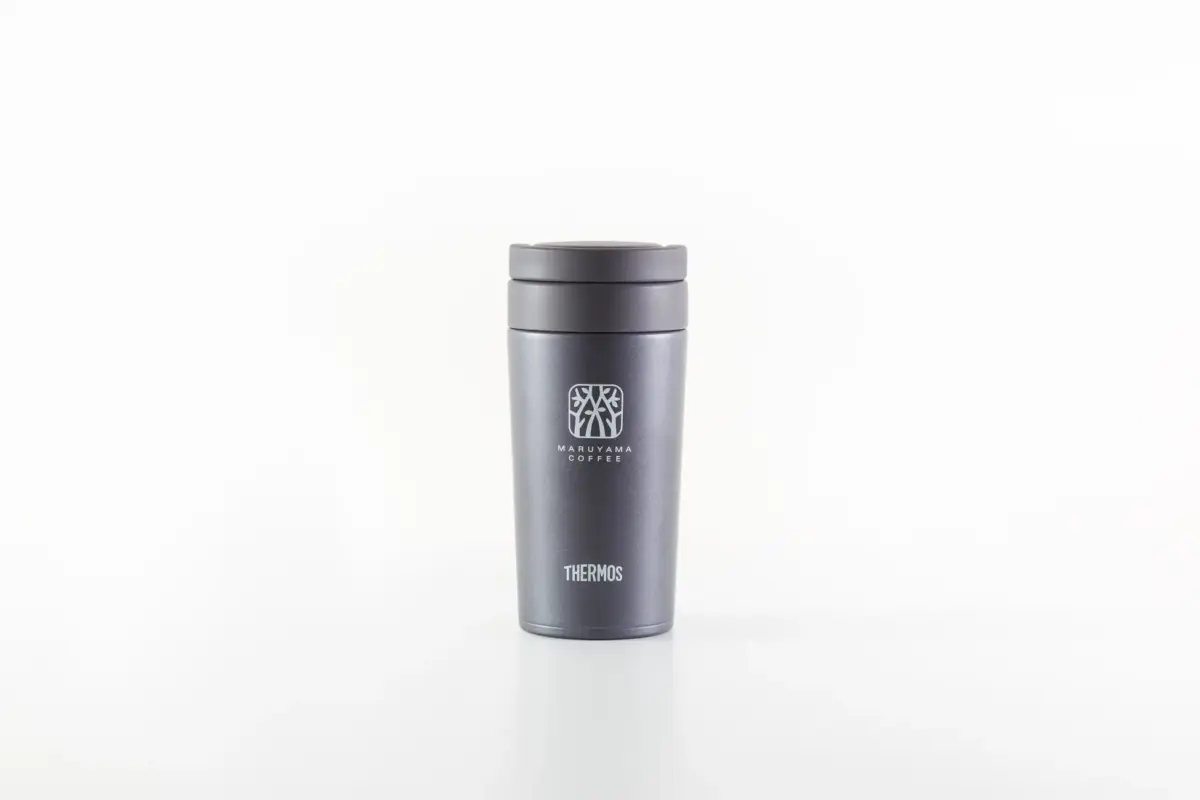 メタリックグレーの本体に丸山珈琲のロゴをあしらったサーモスのマグボトルです。ステンレス製の魔法びん構造でホットとアイスの両方に対応しており、飲み頃温度を長時間キープします。蓋部分には折りたためるキャリーハンドルが付いているため、ちょっとした持ち運びにも大変便利です。