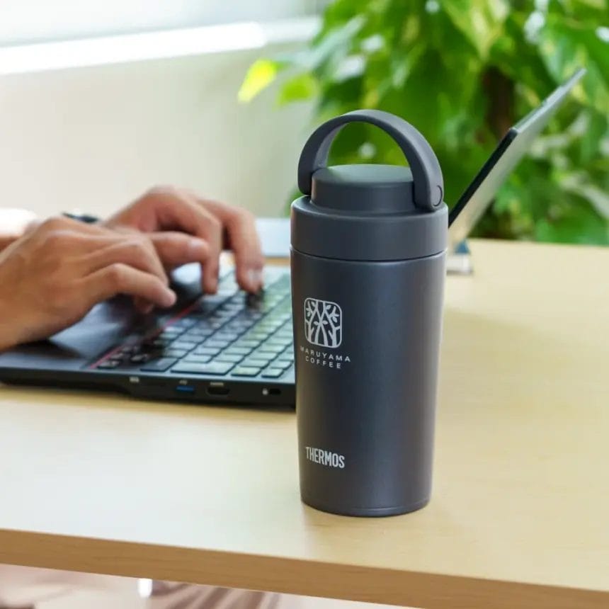 メタリックグレーの本体に丸山珈琲のロゴをあしらったサーモスのマグボトルです。ステンレス製の魔法びん構造でホットとアイスの両方に対応しており、飲み頃温度を長時間キープします。蓋部分には折りたためるキャリーハンドルが付いているため、ちょっとした持ち運びにも大変便利です。