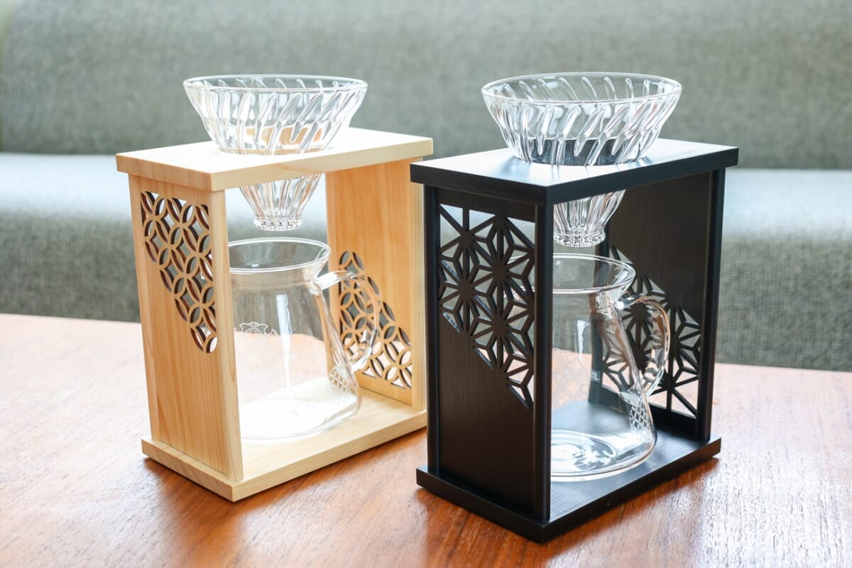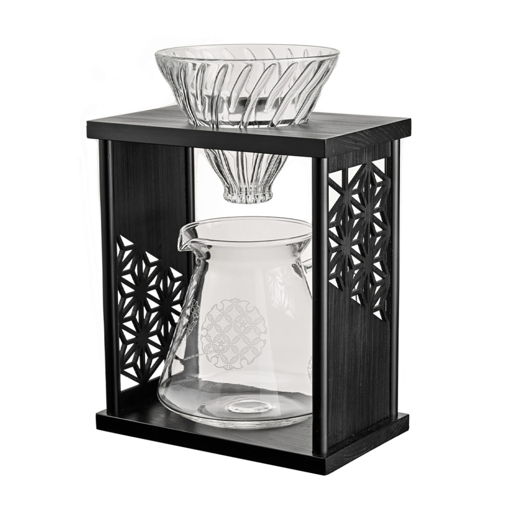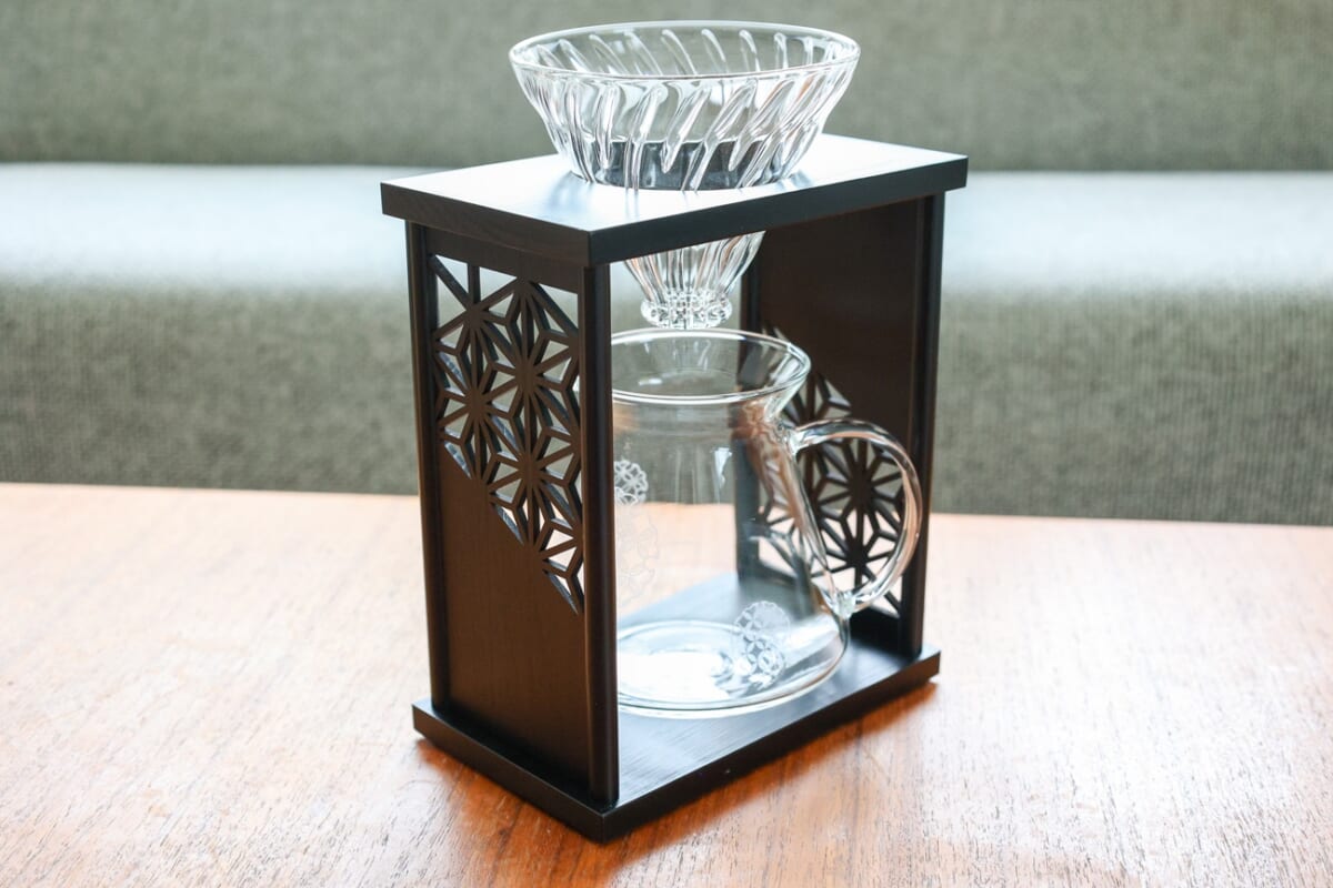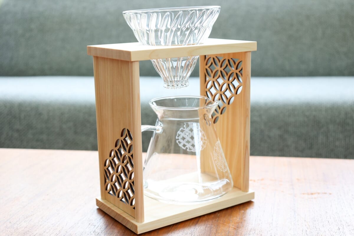 この「ドリップスタンドセット」は、ただコーヒーを抽出するための道具ではありません。コーヒーをより美しく淹れるためのアイテムです。天然木を贅沢に使用した台座に、丁寧に刻まれた日本の伝統文様。そこにガラスのドリッパーやサーバーをセットすることで、機能的な器具としての側面だけでなく、一つの美しいオブジェとしても楽しめます。