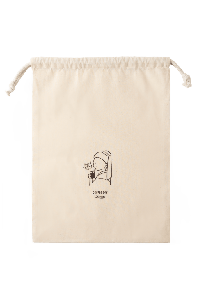 今回のコラボレーションを記念して、COFFEE BOY氏による直筆メッセージ「GOOD COFFEE TIME!(しあわせなコーヒー時間を)」をあしらった、リバーズオンラインストアとリバーズ公式楽天市場店限定の巾着も販売。小物入れとしてちょうどいいサイズ感です。