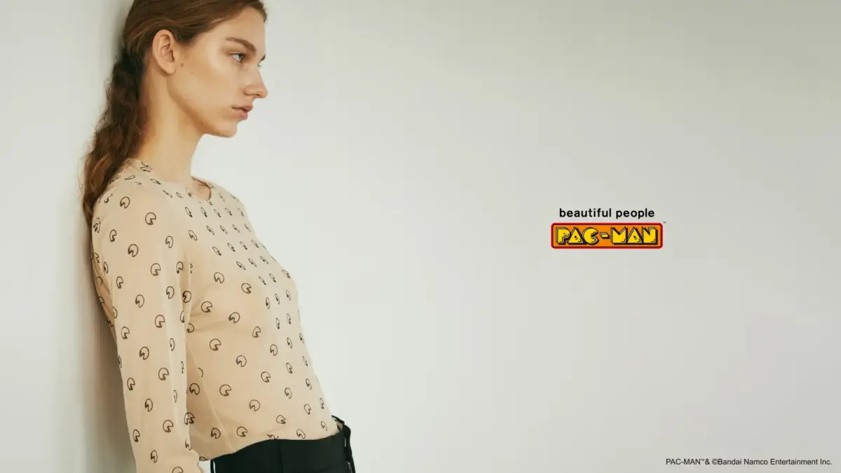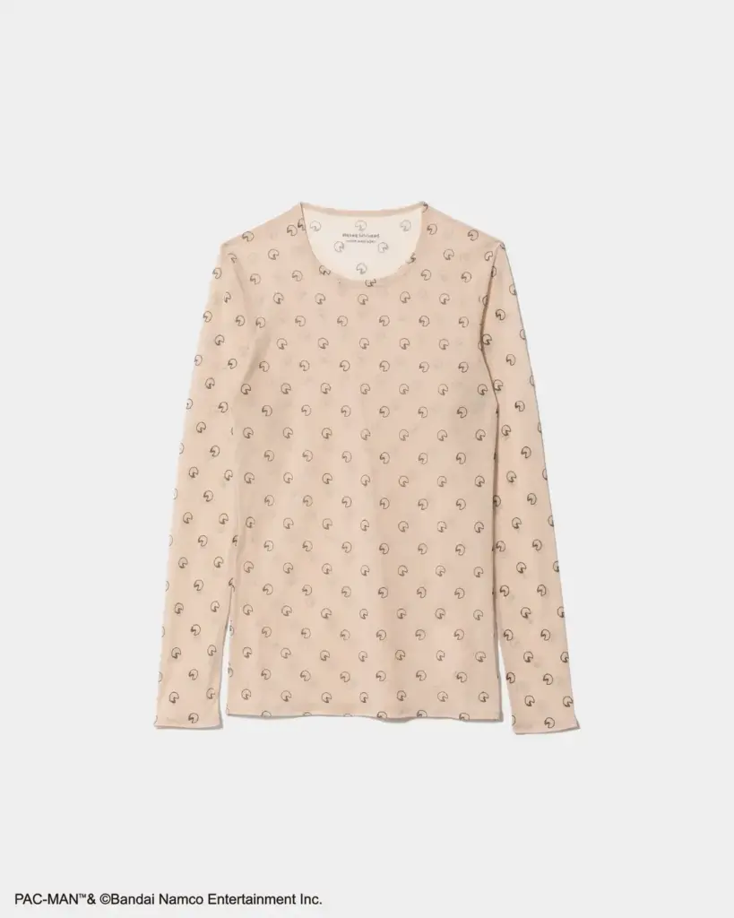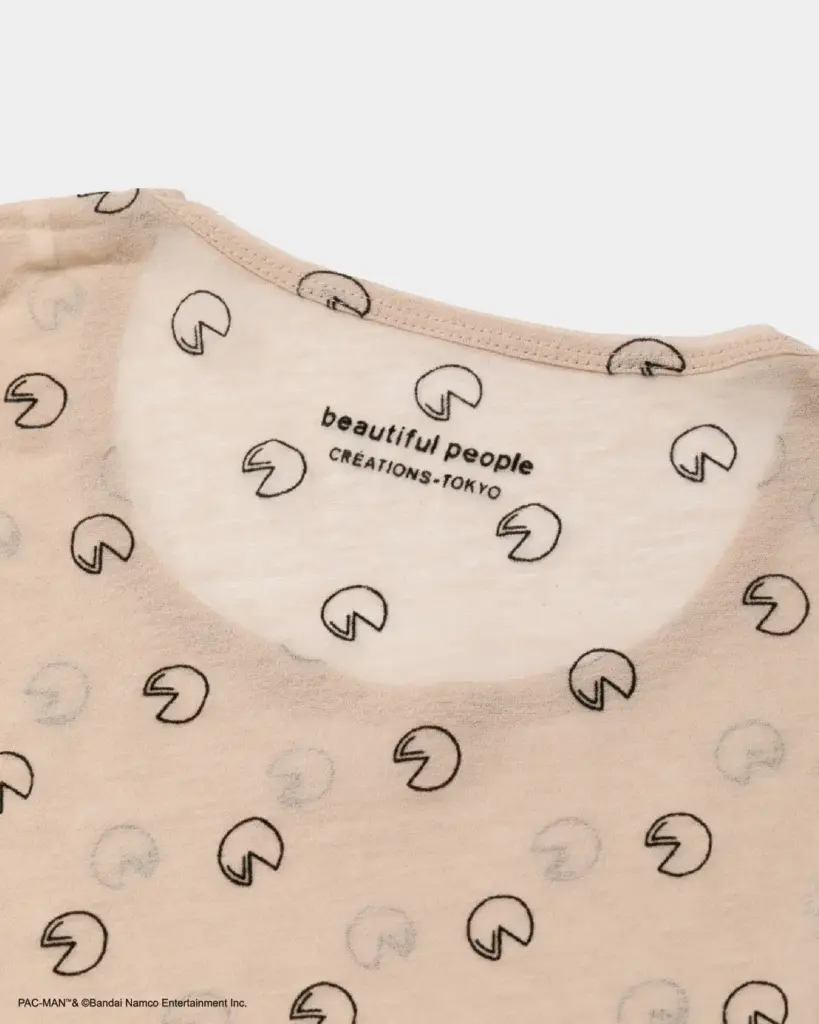 コットン100%のシアージャージー素材を使用。繊細な透け感と柔らかな肌触りが特徴の上質な生地に、『パックマン』をプリントしました。繊細なシアー素材と遊び心あふれる『パックマン』。相反する要素を組み合わせることで、クラフトとポップカルチャーを融合させた、beautiful peopleらしいアイテムに仕上がりました。