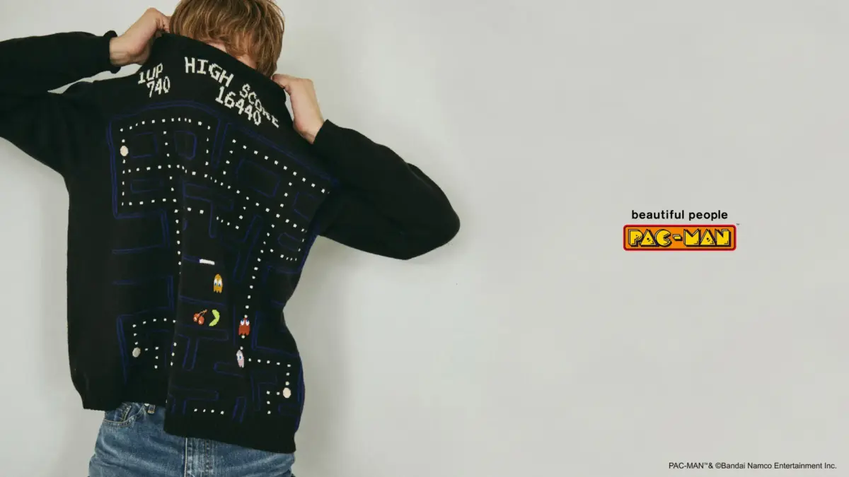 beautiful peopleならではのインターシャ、ジャカード、刺繍という3つの技法で、パックマンのゲーム画面を再現しました。
