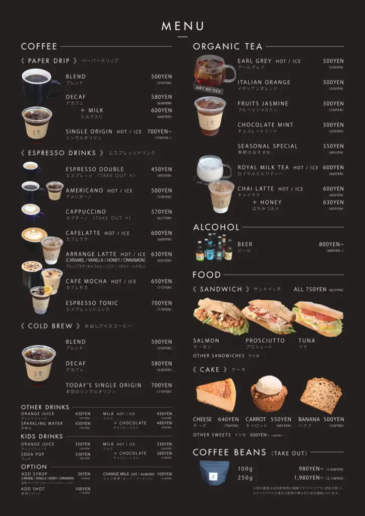 ラテ、カプチーノ、アメリカーノなど、定番のエスプレッソドリンクから、水出しアイスコーヒー等をご用意。