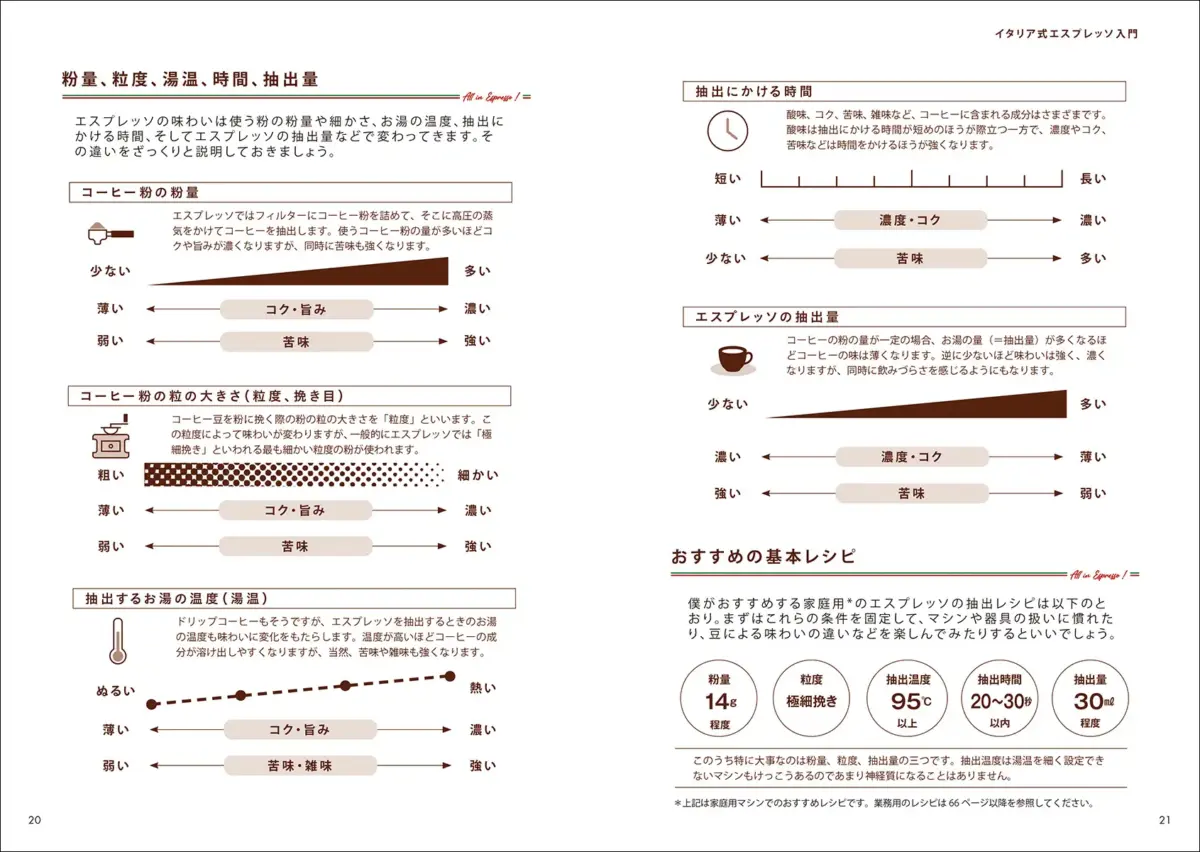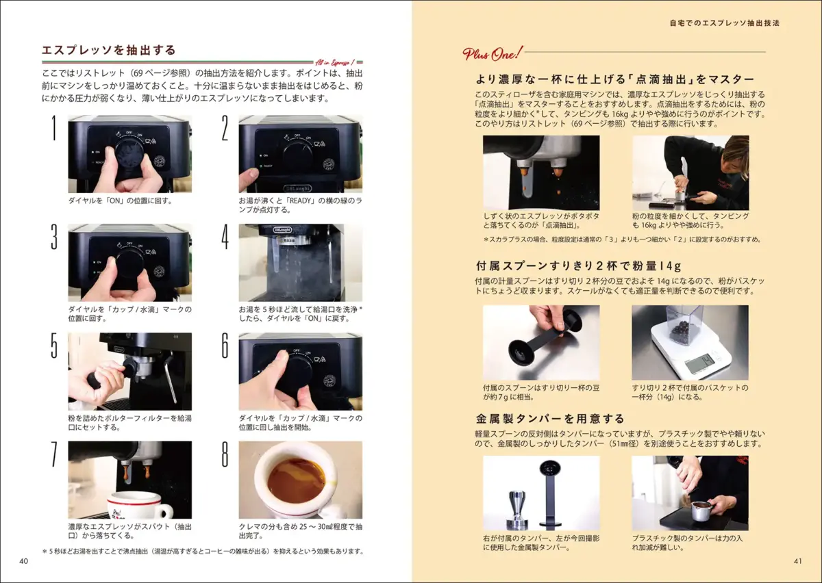 本書は、自宅でのエスプレッソの淹れ方や必要な道具・機材を一般向けにわかりやすく解説。