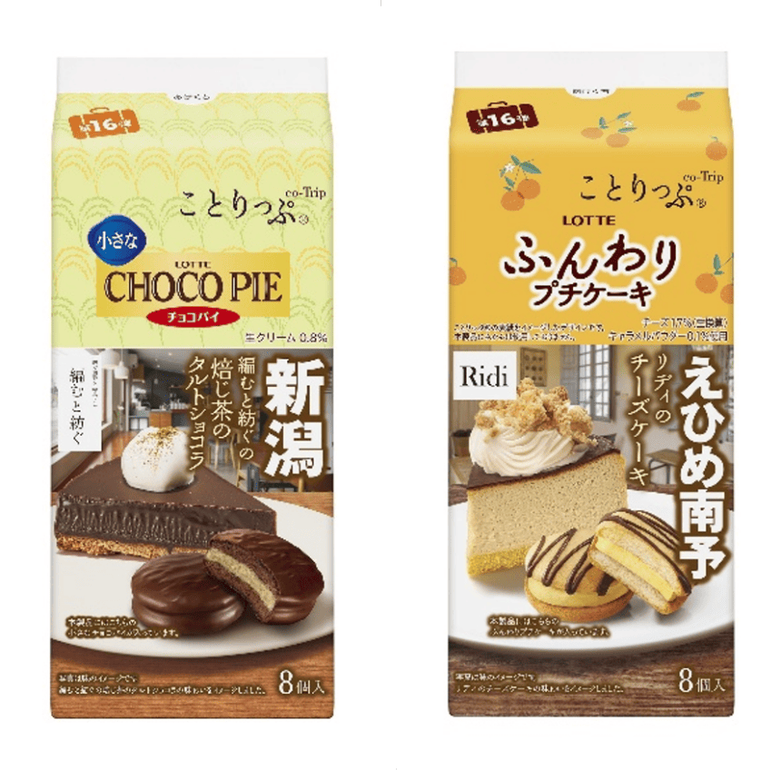今回「地元で愛される名店」をテーマに発売する、新潟「ことりっぷ 小さなチョコパイ<編むと紡ぐの焙じ茶のタルトショコラ>」とえひめ南予「ことりっぷ ふんわりプチケーキ<リディのチーズケーキ>」は、ロッテとことりっぷ、そして地元自治体観光担当者、さらに地元で愛されている名店の4社が共同開発した自信作です。