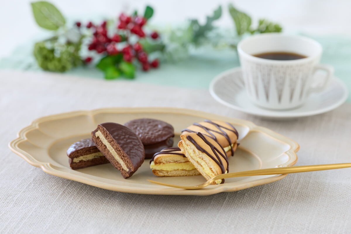 焙じ茶パウダーを配合したクリームを、チョコレートを練り込んだ生地でサンドし、焙じ茶とチョコレートの味わいをバランスよく楽しめるように仕立てました。