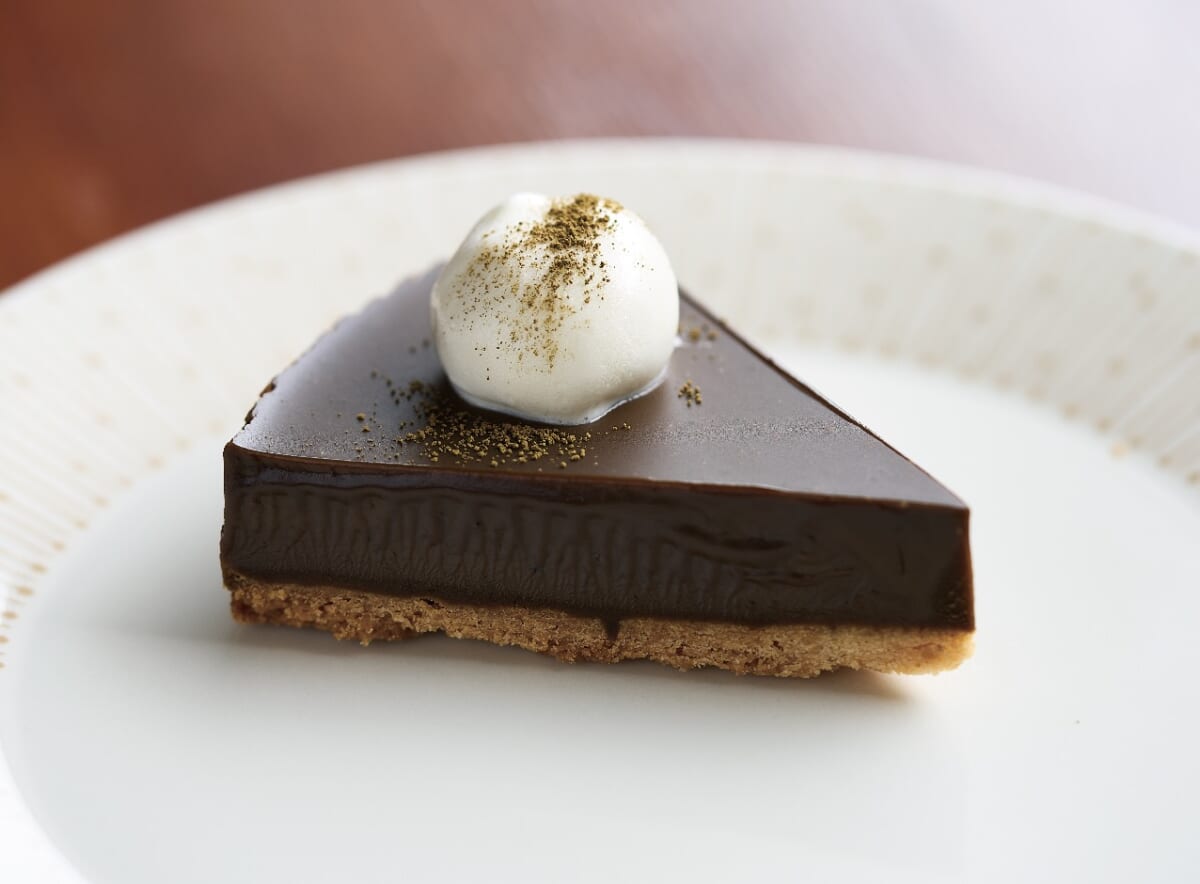 「焙じ茶のタルトショコラ」は、店主こだわりの焙じ茶を使用した編むと紡ぐの人気スイーツ。香ばしく、心地良い食感に焼き上げたタルト生地と焙じ茶の香りが、濃厚なチョコレートを引き立てます。コーヒーと合わせることで更に美味しく感じられます。