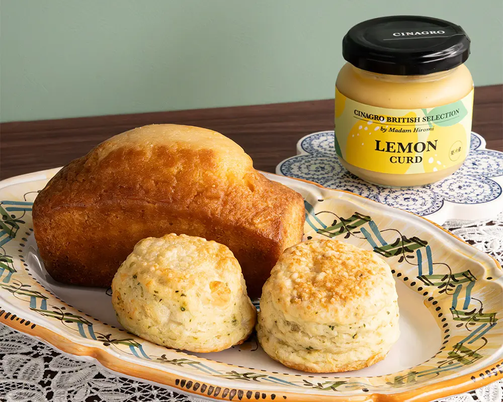 ●〈シナグロ ブリティッシュ セレクション バイ マダムヒロミ〉パルミジャーノ香る有機クレソンのスコーン 368円、アンのレモンケーキ 998円、四万十有機レモンのカード 1,280円