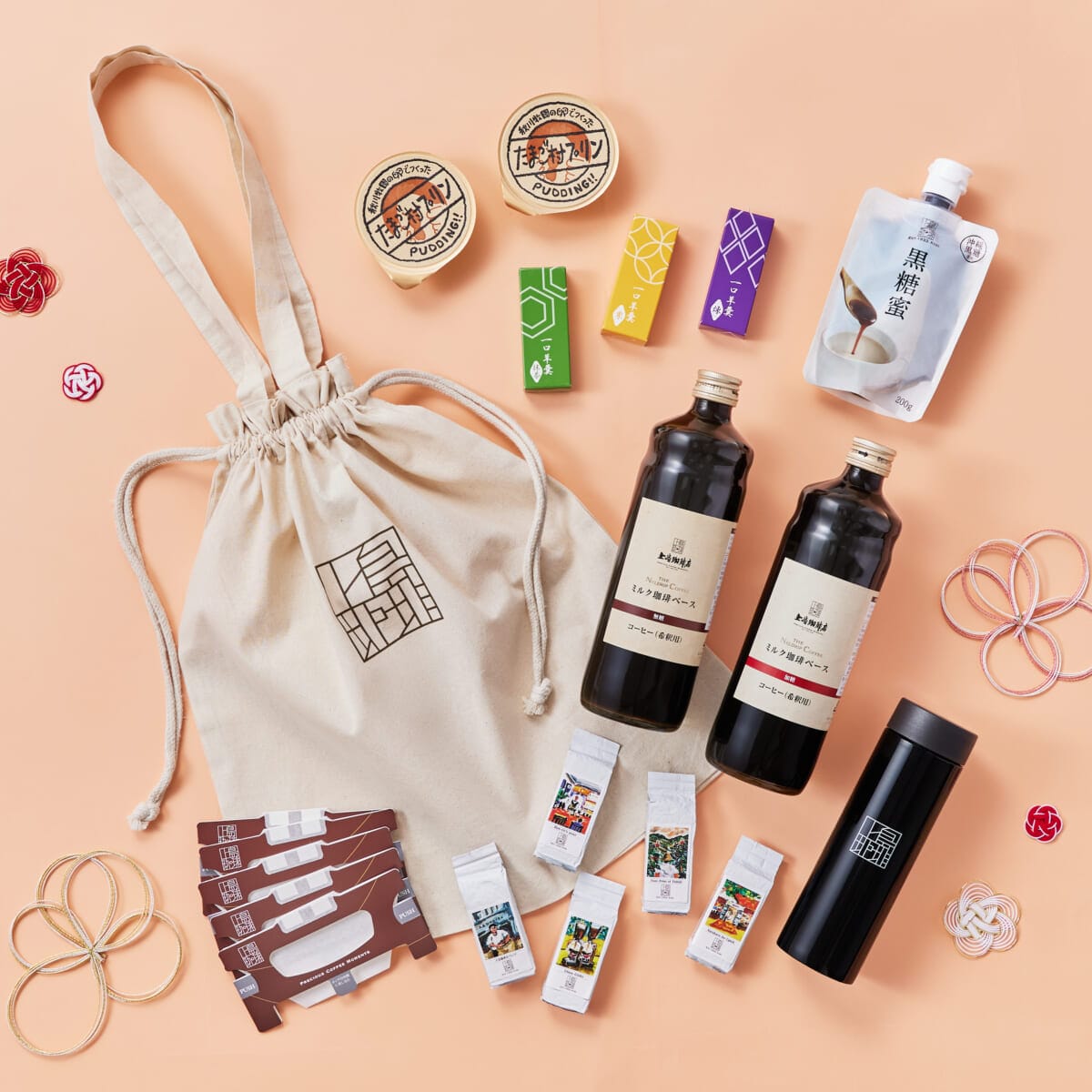 UCCグループの様々なアイテムを取り扱うUCC公式オンラインストアでは、今年に入り、お客さまにさらに多様なコーヒーの楽しみ方を知っていただきたいと考え、COFFEE STYLE UCC株式会社が販売するUCC独自技術「フレッシュキューブ」※1でコーヒーを1杯分ずつ真空パックしたワンドリップコーヒー『CAFE@HOME(カフェアットホーム)』や、主力カフェ業態『上島珈琲店』 の店頭販売アイテムを新たにラインアップに加えました。今回は、そのラインアップより、お客さまの飲用スタイルや好みに応じて選んでいただけるよう、UCC飲用スタイル別詰め合わせセット3種(豆・粉・ワンドリップ)・フレッシュキューブセット2種・上島珈琲店のコーヒー詰め合わせ、の全6種を数量限定で販売します。福袋の中には、限定アイテムとして、カップやマグなどをモチーフにした可愛らしいUCCオリジナルキャラクター入りのブランケットやマグを含むセットや、店舗ロゴ入りのシックなボトルと巾着になる便利なトートバッグ付きセットをご用意しています。