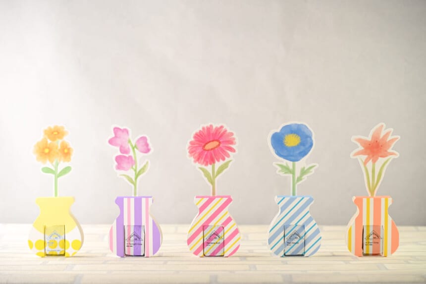 お客さまはシーンやデザイン、花言葉などから好みのコーヒーと花を選び、選んだコーヒーと同じデザインのフラワーベースにペーパーフラワーを挿してお渡しします。