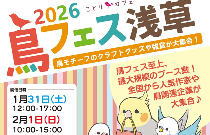 「小鳥たちを眺めながら、まったりコーヒータイム♪」をコンセプトにした「ことりカフェ上野本店」( http://kotoricafe.jp/ )を運営する株式会社ことりカフェ(本社:東京都台東区 代表取締役 川部志穂)は、今月末に日本を代表する観光地「浅草」にて、“鳥好きによる鳥好きのためのフェスタ”「鳥フェス浅草2026」(主催:ことりカフェ)を開催いたします。今年もさらにスケールアップして、約200のクリエイター&ことり雑貨が大集合する他、飼育用品メーカーも各社出店しますので、愛鳥さんのお土産も。見ごたえたっぷりの2日間、浅草観光とともに満喫してください。