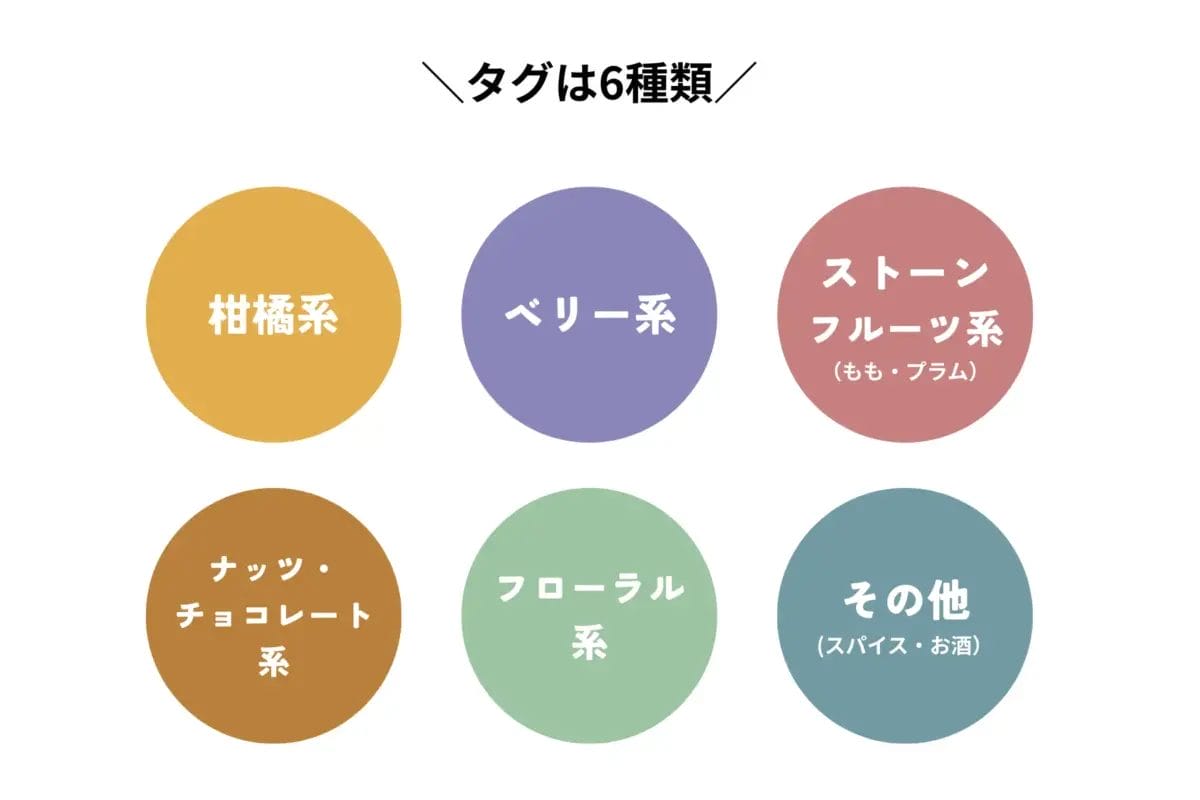 柑橘系 / ベリー系 / ストーンフルーツ系(もも・プラム) / ナッツ・チョコレート系 / フローラル系 / その他(スパイス・お酒)