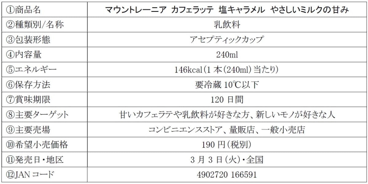 森永乳業は、チルドコーヒー売上No.1ブランド※1「マウントレーニア」から、「マウントレーニア カフェラッテ 塩キャラメル やさしいミルクの甘み」を、3月3日(火)より全国にて期間限定発売いたします。
