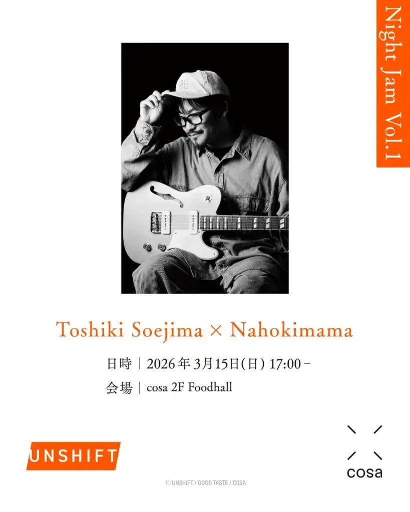 cosa Foodhallで新たにスタートするナイトイベント。第1弾は、世界的に注目を集めるネオ・ソウル・ギタリスト Toshiki Soejima が登場!!