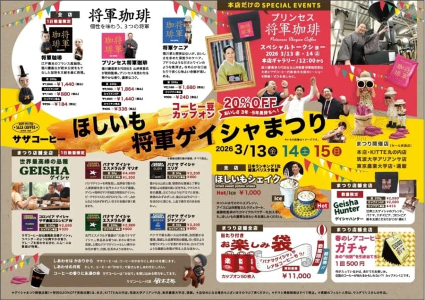 コーヒー愛好家の皆さん、朗報です!サザコーヒーが2026年3月13日(金)から3月15日(日)の3日間、「将軍 ほしいいも ゲイシャまつり」を開催します。この期間中、コーヒー豆やカップオンコーヒーが全品20%OFFになるほか、普段はなかなか手が出ない世界最高峰のゲイシャコーヒーがお得に手に入るチャンスです。オンラインストアでも特別販売が行われます。