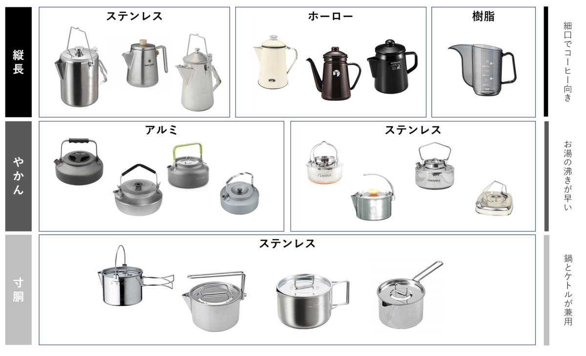 実際に、アウトドアやキャンプで使われているコーヒーケトルのカオスマップも作成したので、マップと一緒に見てみてくださいね。