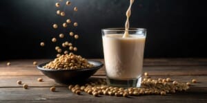Gentle stream of soy milk flows into a glass on a dark background creating a sense of calmness and serenity kitchen setup soymilk pouring