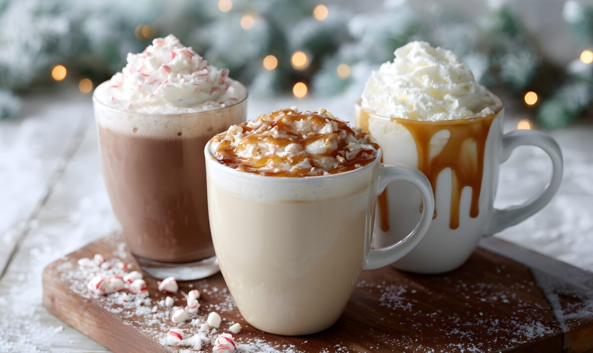 three drinks one is a Peppermint Mocha Cappuccino the second one is a Candy Cane White Chocolate Hot Chocolate and the third one is a White Chocolate Caramel Cappuccino with an elegantt winter back