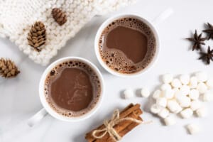 White ceramic cups of hot cocoa on top of white marble background top view
